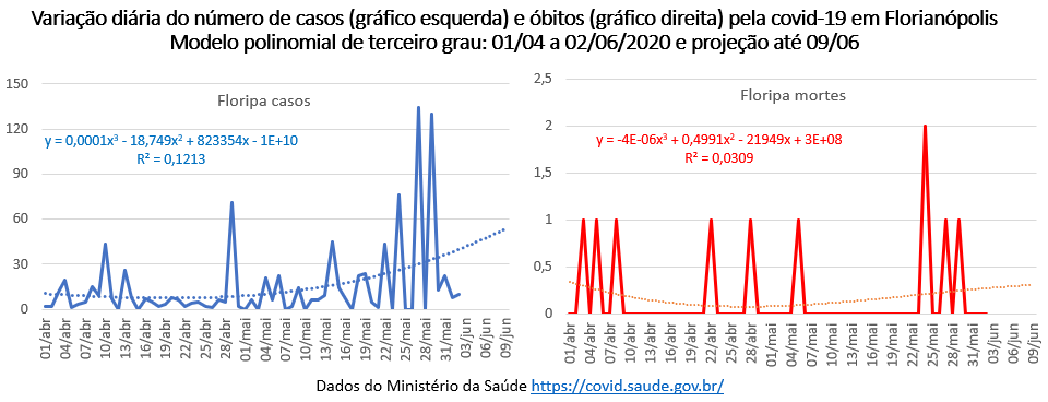 Os gráficos do número diário de casos e de mortes de Florianópolis mostram valores mais altos para o número de casos e a mesma tendência de aumento. Mas os números de mortes continuam também baixos, sendo que houve duas mortes apenas no dia 24/05 e no máximo uma morte em 24 horas nos outros dias. O mais importante é que não há tendência de aumento e sim uma tendência de manter o número de falecimentos por conta da covid-19 sob controle.