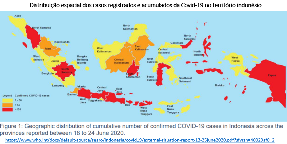 Na Indonésia, os dois primeiros casos foram registrados no dia 02 de março – um professor de dança e sua mãe. Ambos haviam organizado um curso de dança e entre os participantes havia um turista japonês que se declarou positivo dias depois. Desde então, o vírus se espalhou para muitas das 17,5 mil ilhas do arquipélago indonésio, tendo como foco inicial o chamado “cluster do curso de dança”. A primeira morte confirmada ocorreu em 11 de março, quando um cidadão britânico de 53 anos morreu em Bali. O mapa abaixo da Organização Mundial da Saúde (OMS) mostra como se distribui o número acumulado de casos registrados da covid-19 nas diversas províncias da Indonésia. Nota-se que a pandemia já se espalhou para grande parte do país, mas com intensidades diferentes.