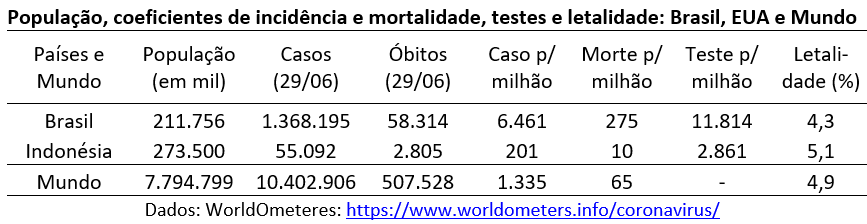 Veja o que já enviamosO Brasil apresentou, no dia 29/06, um coeficiente de incidência de 6.461 casos por 1 milhão de habitantes, contra 201 casos por milhão da Indonésia e 1.335 casos por milhão da média mundial. O coeficiente de mortalidade foi de 275 mortes por milhão de habitantes no Brasil, 10 mortes por milhão na Indonésia e 65 mortes por milhão na média mundial. A taxa de letalidade no Brasil foi de 4,3%, contra 5,1% na Indonésia e de 4,9% na média mundial. Em parte, essa menor taxa de letalidade do Brasil reflete a maior testagem em relação à Indonésia.