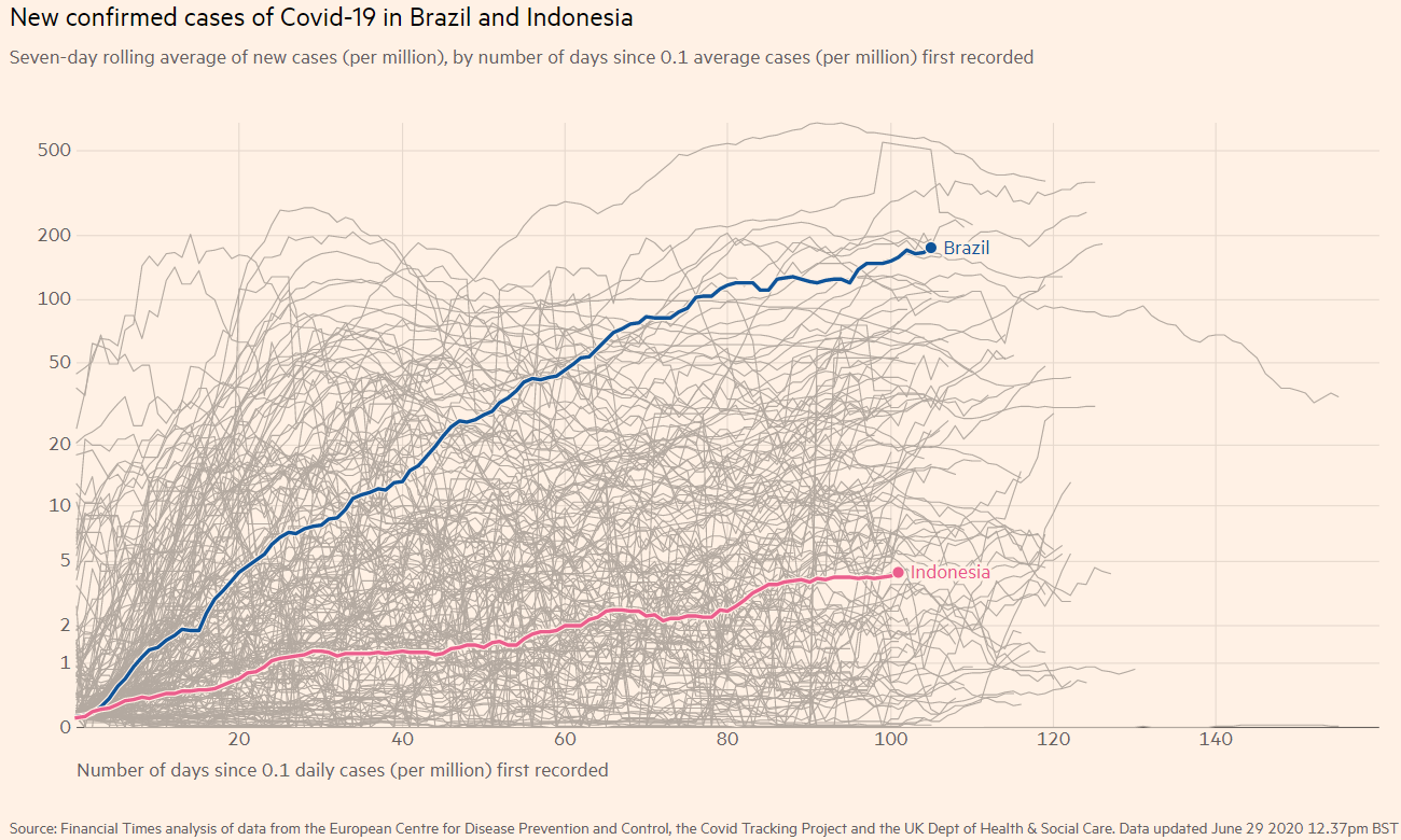 O gráfico abaixo, do jornal Financial Times, apresenta a média móvel de sete dias no número diário de casos e o tempo transcorrido desde o início, quando se atingiu a média de 3 pessoas infectadas. Nota-se que o Brasil não apenas tem um coeficiente de incidência (6,5 mil casos por milhão de habitantes) maior do que o da Indonésia (201 casos por milhão), como a curva brasileira é mais vertical, indicando uma maior velocidade na propagação dos casos.