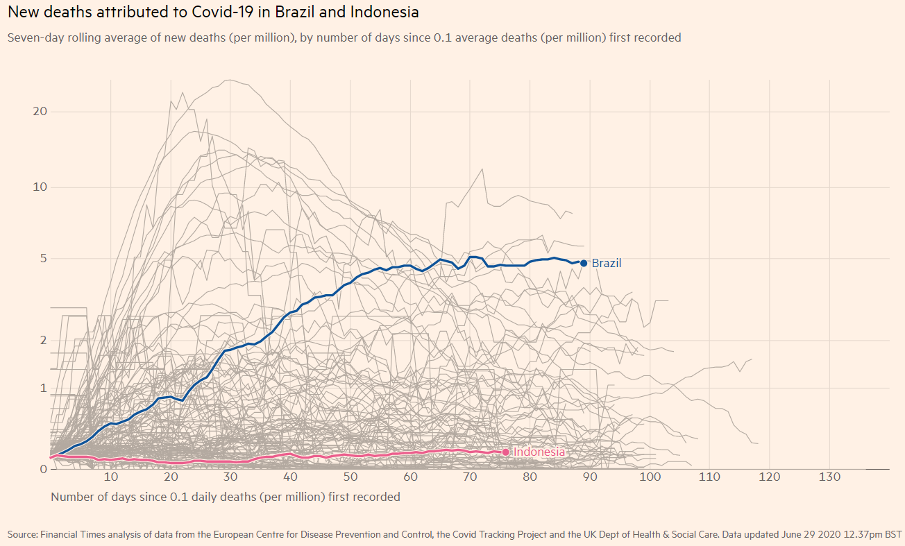 O primeiro caso no Brasil já completou 4 meses e o primeiro caso da Indonésia também completa os mesmos 4 meses neste início de julho. Neste período, a pandemia avançou nos dois países, mas em ritmo mais veloz no território brasileiro. A tabela abaixo mostra que embora o Brasil tenha uma população menor do que a Indonésia, tem cerca de 20 vezes mais casos e mais mortes. Em parte, esta grande diferença se deve ao menor número de testes da Indonésia (2,8 mil testes por milhão de habitantes), mas, embora as duas nações tenham cometido erros na contenção inicial da doença, o surto indonésio tem sido menos intenso do que o surto pandêmico brasileiro.