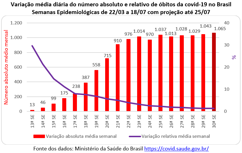 O Brasil manteve uma média de vidas perdidas para a covid-19 pouco acima de 1 mil óbitos diários nas últimas 7 semanas. A curva se manteve em um alto platô, porém, os últimos 7 dias foram os mais letais. No dia 17 de março de 2020, o Brasil registrou uma única morte (a primeira) pela covid-19. Quatro meses depois foram registradas, em média, 1.043 mortes a cada 24 horas na 29ª Semana Epidemiológica (12 a 18 de julho).
