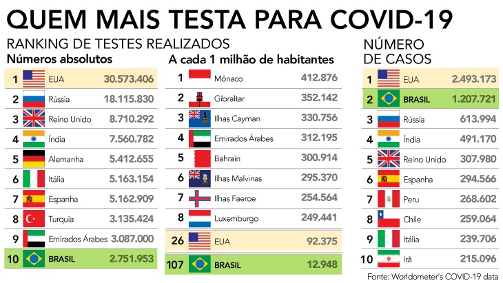 Segundo a OMS, quanto mais casos o país registra, mais testes devem ser feitos. O número de pessoas testadas deveria ser de 10 a 30 vezes o de infecções confirmadas. Ontem o Brasil chegou a mais de 1,2 milhão de casos. Logo, deveríamos ter feito entre 12 milhões e 36 milhões de testes e não 2,7 milhões, em números absolutos, como registrado pelo Worldometers.