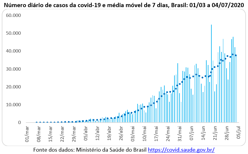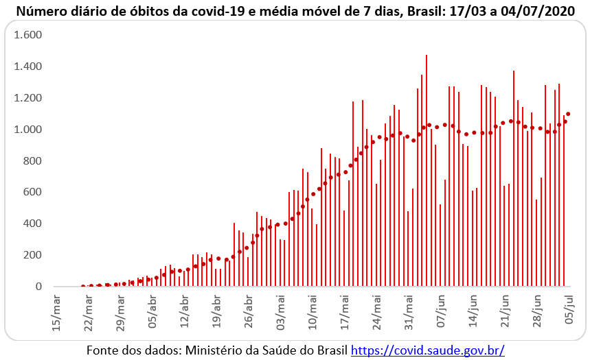 O gráfico abaixo mostra as variações absolutas diárias do número de óbitos no território nacional entre 17/03 a 04/07 e a média móvel de 7 dias. Nota-se que o número de vidas perdidas cresceu rapidamente até o final de maio e nas últimas 6 semanas tem oscilado em torno de 1 mil mortes por dia. O cume da variação diária ocorreu no dia 04 de junho, com 1.473 óbitos em 24 horas. Mas neste dia a média móvel de 7 dias indicava um valor de 1.038 óbitos, montante que subiu para 1.058 óbitos no dia 23 de junho. No dia 04 de julho a média móvel indicava 1.028 óbitos. Desta forma, a curva epidemiológica de óbitos está estacionada em um alto platô, sem uma clara tendência de aumento ou de declínio.