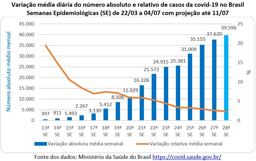 O gráfico abaixo mostra a variação média diária do número de casos no Brasil, nas diversas semanas epidemiológicas (SE). Nota-se que o número de pessoas infectadas passou de 397 casos na 13ª SE (22 a 28/03), para 3,130 pessoas na 17ª SE e mais do que decuplicou até a 25ª SE. Mesmo ultrapassando a cifra de 30 mil casos diários, o surto pandêmico continuou avançando e chegou à média de 37.620 casos diários na 27ª SE (28/06 a 04/07), com variação relativa de 2,6% ao dia. Como sempre fazemos todos os domingos e para contribuir com as avaliações das tendências epidemiológicas, apresentamos uma projeção para a 28ª SE (05 a 11/07), que indica 39,5 mil casos diários no Brasil, com aumento relativo de 2,3% ao dia.