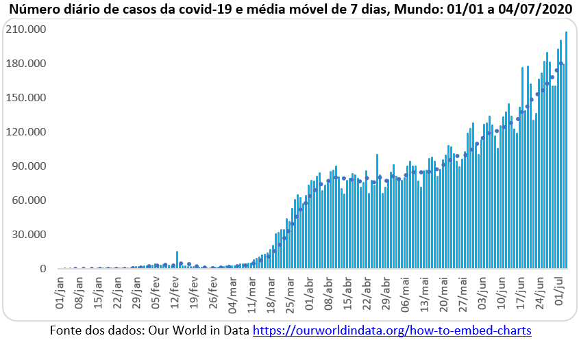 O planeta virou o dia 04 de julho com 11,4 milhões de pessoas infectadas e 533 mil mortes, com uma taxa de letalidade de 4,7%. Parecia que o mundo tinha alcançado o pico em meados de abril, mas o número de casos continuou crescendo aceleradamente a partir de maio, conforme mostra o gráfico abaixo. Nos primeiros dias de julho o mundo ultrapassou a marca de 200 mil casos diários. A média móvel de 7 dias está na casa de 180 mil casos diários e continua subindo.
