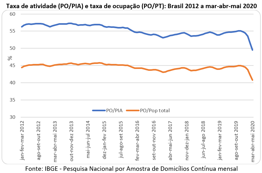 A pesquisa do IBGE mostra que a população ocupada (PO) diminuiu enquanto a população em idade ativa (PIA) e a população total (PT) aumentaram. O resultado é a redução das taxas de atividade e de ocupação. O gráfico abaixo mostra que a taxa de atividade (PO/PIA) era de 57% no trimestre mar-abr-mai de 2012 e caiu para 49,5% no trimestre mar-abr-mai de 2020. Pela primeira vez na história brasileira, menos da metade das pessoas de 14 anos e mais está trabalhando. Em relação ao conjunto da população, a taxa PO/PT era de 45% no trimestre mar-abr-mai de 2012 e caiu para 40,8% no trimestre mar-abr-mai de 2020.