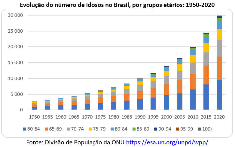 Entre 1950 e 1955, o acréscimo foi de 475 mil idosos no Brasil e no quinquênio 2015 e 2020 o acréscimo quinquenal foi de 5,4 milhões de idosos. As projeções da ONU indicam que a população brasileira vai passar de 212 milhões de habitantes em 2020 para 219 milhões em 2025, com 36 milhões de idosos, representando 16,5% do total em 2025. Isto é, somente nos 12 meses de 2020 haverá um acréscimo de 1,25 milhão de idosos (de 60 anos e mais) no Brasil.