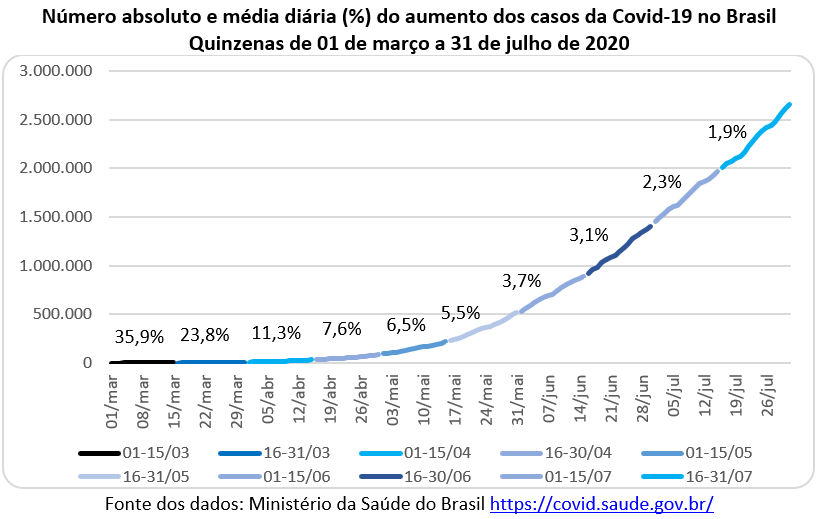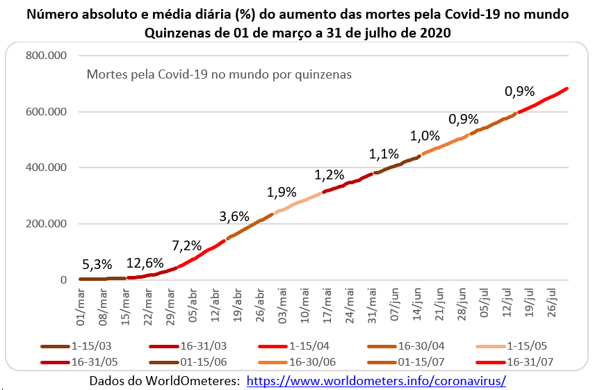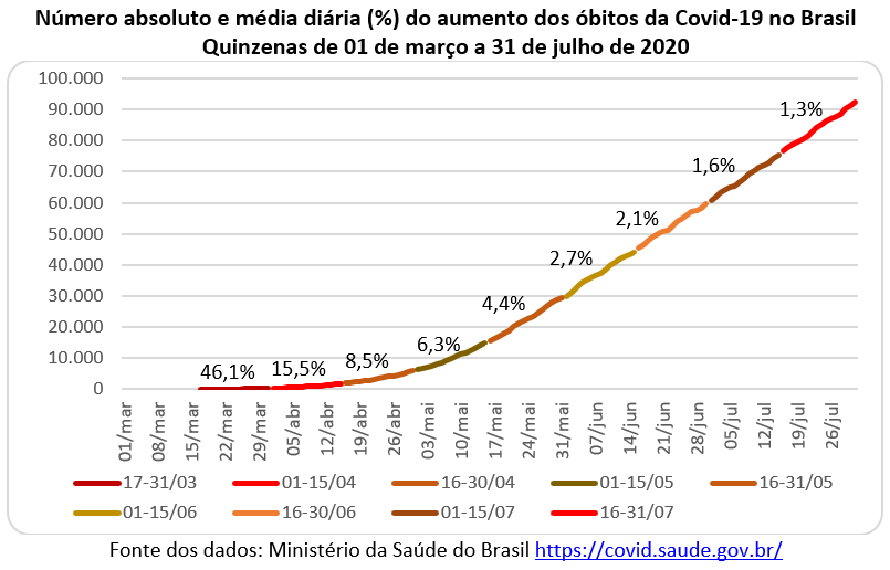 O gráfico abaixo mostra a evolução do número de vidas perdidas nas sucessivas quinzenas, a partir de 17 de março quando houve a primeira morte no Brasil. Na quinzena de 16 a 31 de março aconteceram 200 mortes com um crescimento diário de 46,1% ao dia. Nas quinzenas seguintes os números absolutos cresceram enquanto os números relativos diminuíram. No dia 16 de julho havia 76,7 mil mortes e passou para 92,5 mil no dia 31 de julho (1,3% ao dia na segunda quinzena de julho). A curva epidemiológica de óbitos também aponta para cima.