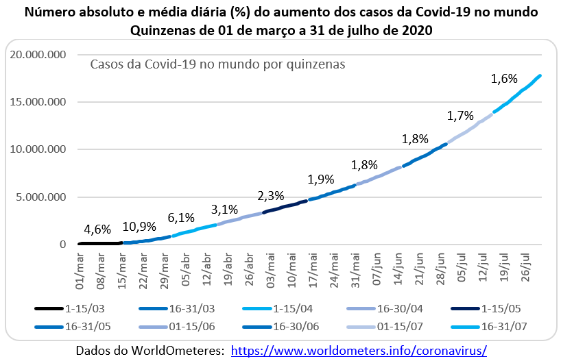 O gráfico abaixo mostra a evolução do número de casos da covid-19 no mundo por quinzena nos últimos 5 meses. Na primeira quinzena de março foram registrados 83 mil casos, com um crescimento médio diário de 4,6%. Na quinzena seguinte houve um salto para 689 mil casos, um crescimento médio relativo de 10,9% ao dia. Na primeira quinzena de abril o número de casos subiu para 1,2 milhão, com uma taxa média de crescimento de 6,1 ao dia. Enquanto cresciam os números absolutos os números relativos iam diminuindo. Na segunda quinzena de julho houve um acréscimo de 4 milhões de casos, com um crescimento médio diário de 1,6% ao dia. Três países são responsáveis pela maioria dos novos casos: EUA, Índia e Brasil. Mas outros países como África do Sul, Colômbia, México e Rússia também se destacam.