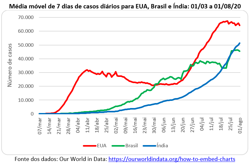 Os Estados Unidos, o Brasil e a Índia estão no topo do ranking dos países mais atingidos pela pandemia do novo coronavírus. Os EUA assumiram o primeiro lugar em número de pessoas infectadas no mês de abril, com cerca de 30 mil caos diários, mas estes números caíram para a casa de 20 mil e o Brasil assumiu a primeira colocação no mês de junho. Porém, a segunda onda dos EUA fez o país voltar à liderança isolada com mais de 60 mil casos diários no mês de julho. Embora o número de casos no Brasil também tenha crescido, a Índia assumiu o segundo lugar no final de julho.