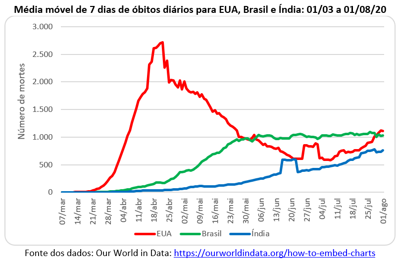 Em relação ao número de mortes, os EUA também ficaram na liderança isolada nos meses de abril e maio e tiveram um pico de mais de 2.500 óbitos diários. Mas o número de vidas perdidas para a covid-19 caiu e o Brasil ultrapassou o número diário de mortes dos EUA no mês de junho e quase todo o mês de julho. Ou seja, o Brasil ficou quase 60 dias na liderança isolada do triste ranking global de vidas perdidas. No final de julho, os EUA voltaram a apresentar números superiores aos do Brasil e a Índia se aproxima cada vez mais dos dois países das Américas.
