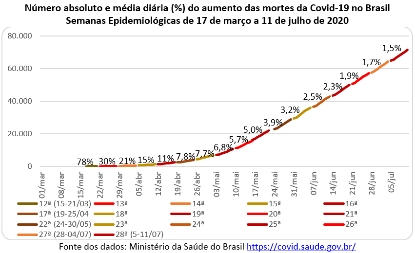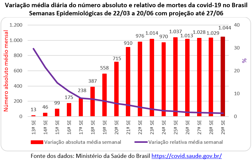 O gráfico abaixo mostra a evolução do número de vidas perdidas nas sucessivas semanas epidemiológicas (SE). O primeiro óbito pela Covid-19 no Brasil ocorreu no dia 17 de março e chegou a 18 óbitos no dia 21/03, o aumento foi de 18 casos em 5 dias, o que representou um crescimento diário de 78,3% na 12ª SE. Nas semanas seguintes, o número absoluto de óbitos subiu continuamente, mas o número relativo diminuiu e chegou a 1,5% ao dia na 28ª SE.