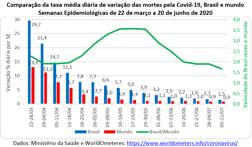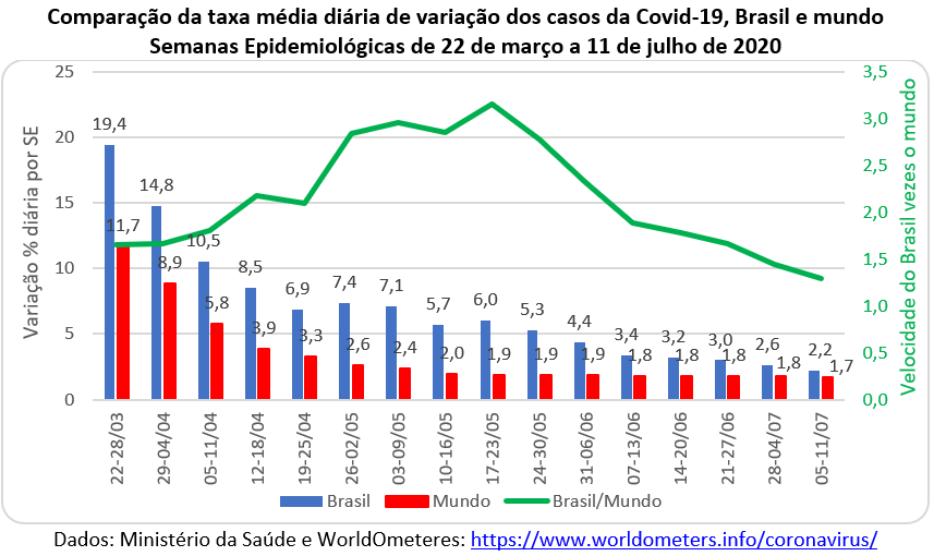 Os dados acima indicam que depois de todo o crescimento ocorrido no primeiro semestre de 2020, a pandemia continua avançando no Brasil e no mundo, embora em um ritmo relativo menor. A velocidade do ritmo do surto pandêmico no Brasil se aproximou do ritmo mundial, mas ainda é 30% maior para os casos e 70% maior para os óbitos, aumentando o peso relativo do país. O Brasil tem 2,7% da população mundial e responde por 14,3% dos casos acumulados e 12,6% das mortes acumuladas globalmente. Nos números diários médios da semana, o Brasil respondeu por 16% dos novos casos e por 18,3% dos novos óbitos na 28ª SE.