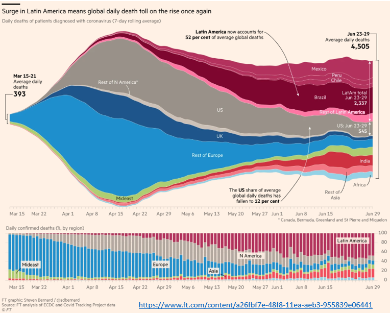 O grande destaque nos meses de maio e junho foi a América Latina que passou a concentrar mais da metade dos óbitos diários no mês de junho. Entre os dias 23 e 29 de junho, a média diária de mortes foi de 4.505 no mundo e de 2.337 mortes na América Latina (52% do total global). Brasil, México, Peru e Chile foram os países que tiveram o maior número de mortes diárias na América Latina. Outros países que estão apresentando números crescentes são a Índia, Paquistão e Bangladesh na Ásia, África do Sul, Egito e Nigéria na África e vários países do Oriente Médio.