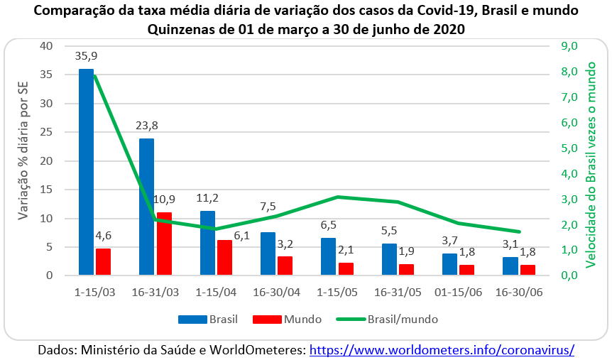 Da mesma forma, o gráfico abaixo apresenta as taxas médias de crescimento diário relativo das vítimas fatais da covid-19 no Brasil e no mundo. Nota-se que a diferença no ritmo de crescimento das mortes diminuiu na 2ª quinzena de março, mas voltou a subir nas quinzenas seguintes e, novamente, caiu na 1ª quinzena de junho. Mesmo assim, o ritmo do aumento das mortes continua 2 vezes mais rápido no Brasil do que na média mundial.