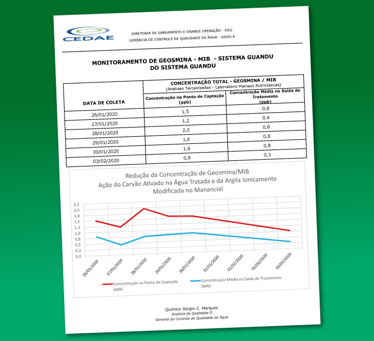 A crise da geosmina começou no dia 6 de janeiro, quando moradores da capital fluminense e da Zona Oeste começaram a se queixar de odor e gosto estranhos na água. A Cedae informou, então, tratar-se de geosmina, composto decorrente da cisão de membranas celulares de cianobactérias. A origem foi uma floração dessas algas na lagoa de captação da Estação de Tratamento de Ãgua do Guandu, em Nova Iguaçu. A pedido do Grupo de Atuação Especializada em Meio Ambiente (Gaema), do Ministério Público do Rio de Janeiro, houve uma série de análises da qualidade do manancial pela Fiocruz. Em março, o portal ((o))eco mostrou que a cianobactéria de gênero Planktrhotricoides foi apontada como a responsável pelo problema.