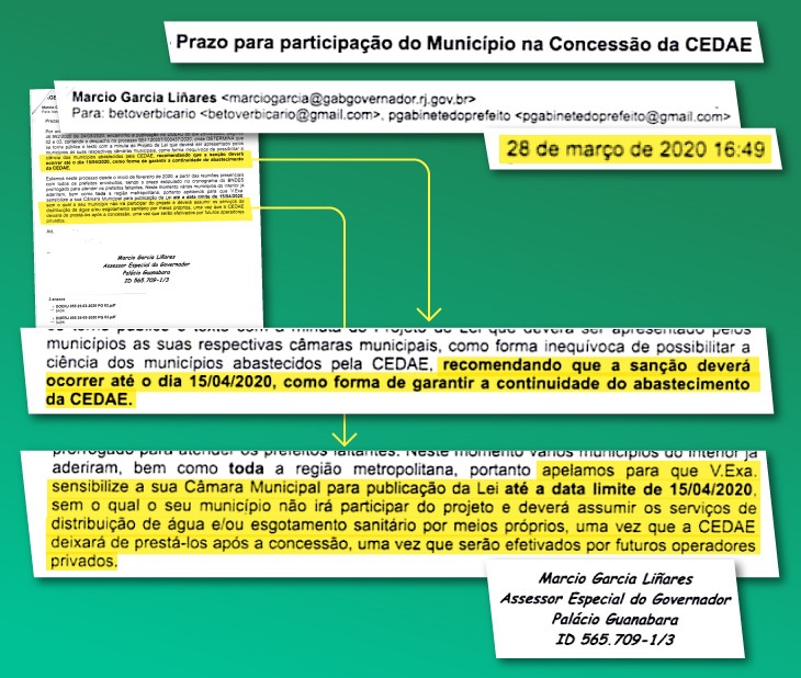 No dia 24 de março, em meio à grave crise do coronavÃrus, o governador Witzel publicou o decreto 46.992, que instituiu a Comissão de Privatização da Cedae, mais um passo em direção a desestatização da companhia de águas e esgoto do Rio, garantia à adesão ao Regime de Recuperação Fiscal do Estado. Quatro dias depois, à s 16h46m, Liñares enviou o e-mail ao prefeito de Macuco; dois minutos depois, a mesma mensagem seguiu para o prefeito de Santa Maria Madalena. Há relatos de que a missiva teria sido enviada a outros prefeitos.